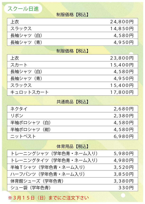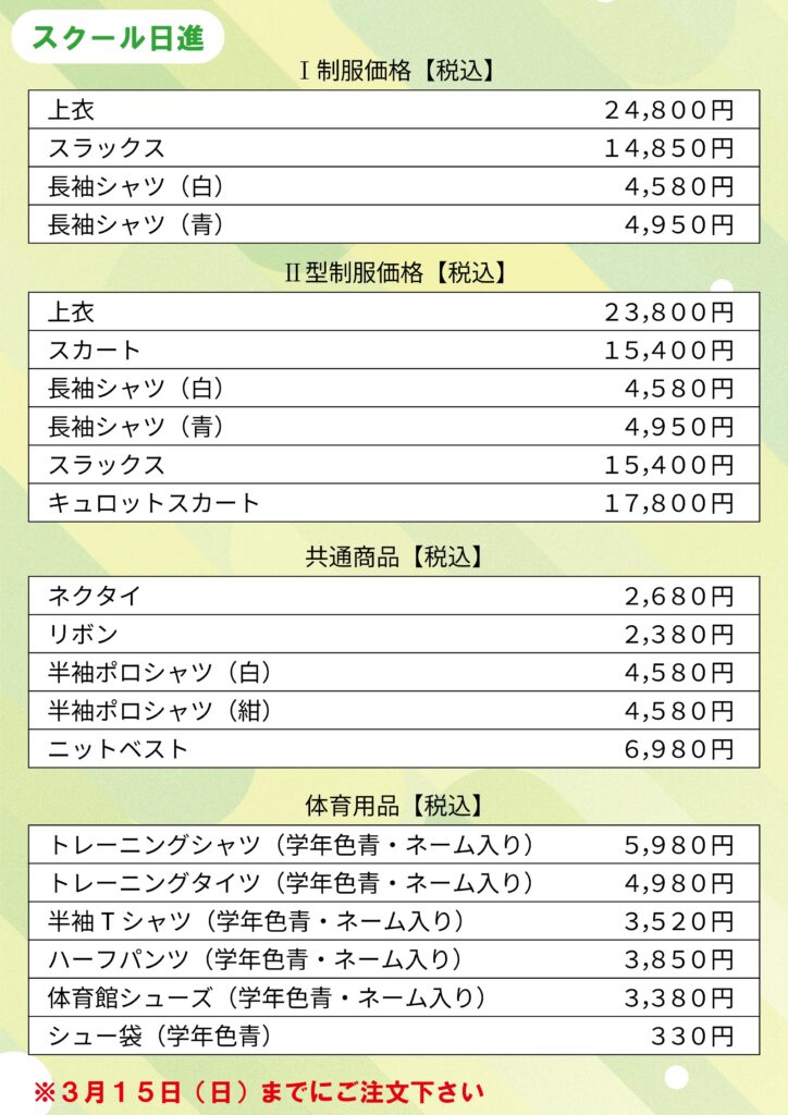 合格おめでとうございます。心よりお喜び申し上げます。スクール日進では学校の指定等を受けました制服を取り扱っています。当店が自信を持ってお勧めする制服をご用命くださいますよう、ご来店を心よりお待ち申し上げております。